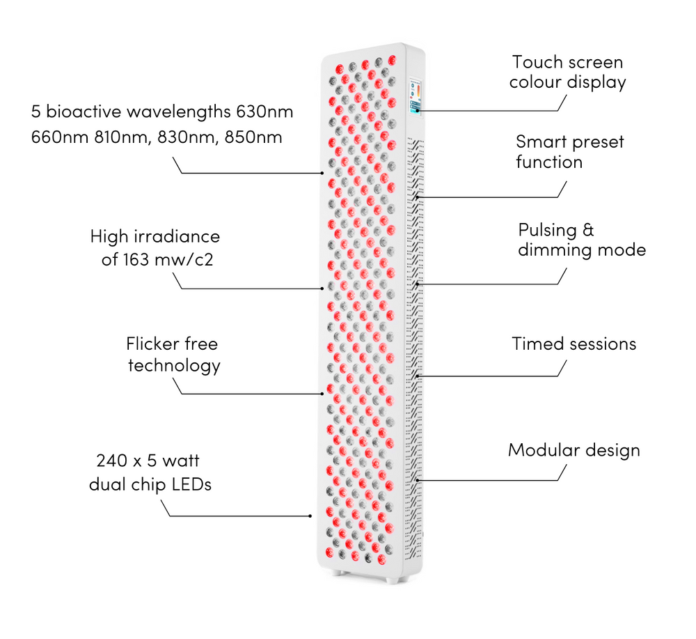 Featuring Multi Wavelength technology delivering the 5 most bioactive wavelengths of 630nm, 660nm, 810nm, 830nm & 850nm. You have the choice to use Red Light or Near-Infrared Light separately or combine the power of the two.