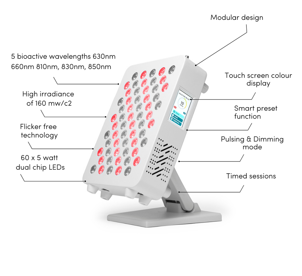 The Baxter Blue range of Red Light Therapy devices pushes the boundaries of design and features that cater to a wide spectrum of health and wellness needs. These devices incorporate state-of-the-art dual chip LED technology to deliver concentrated wavelengths of red and near-infrared light, designed to penetrate deep into tissues to promote cellular repair, rejuvenation, and energy production.